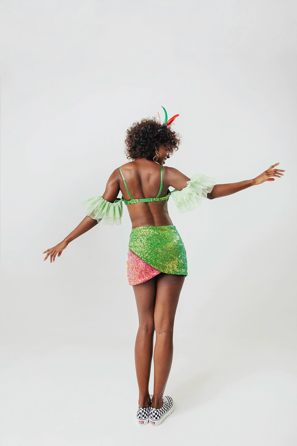 Um espetáculo em forma de saia! Feita em paetês vibrantes, essa saia mescla tons de verde, laranja e pink em uma combinação de tirar o fôlego. Com drapeados que valorizam o corpo e uma presença que vai arrancar suspiros!